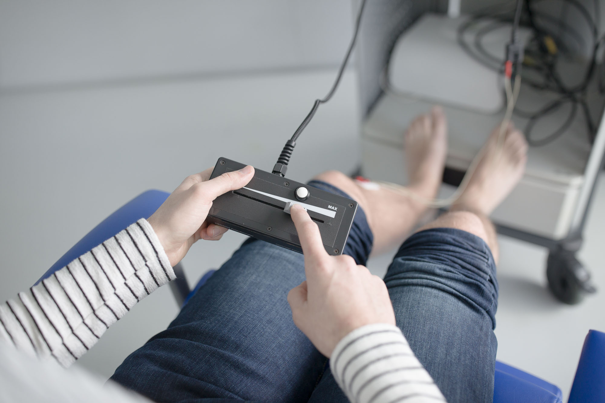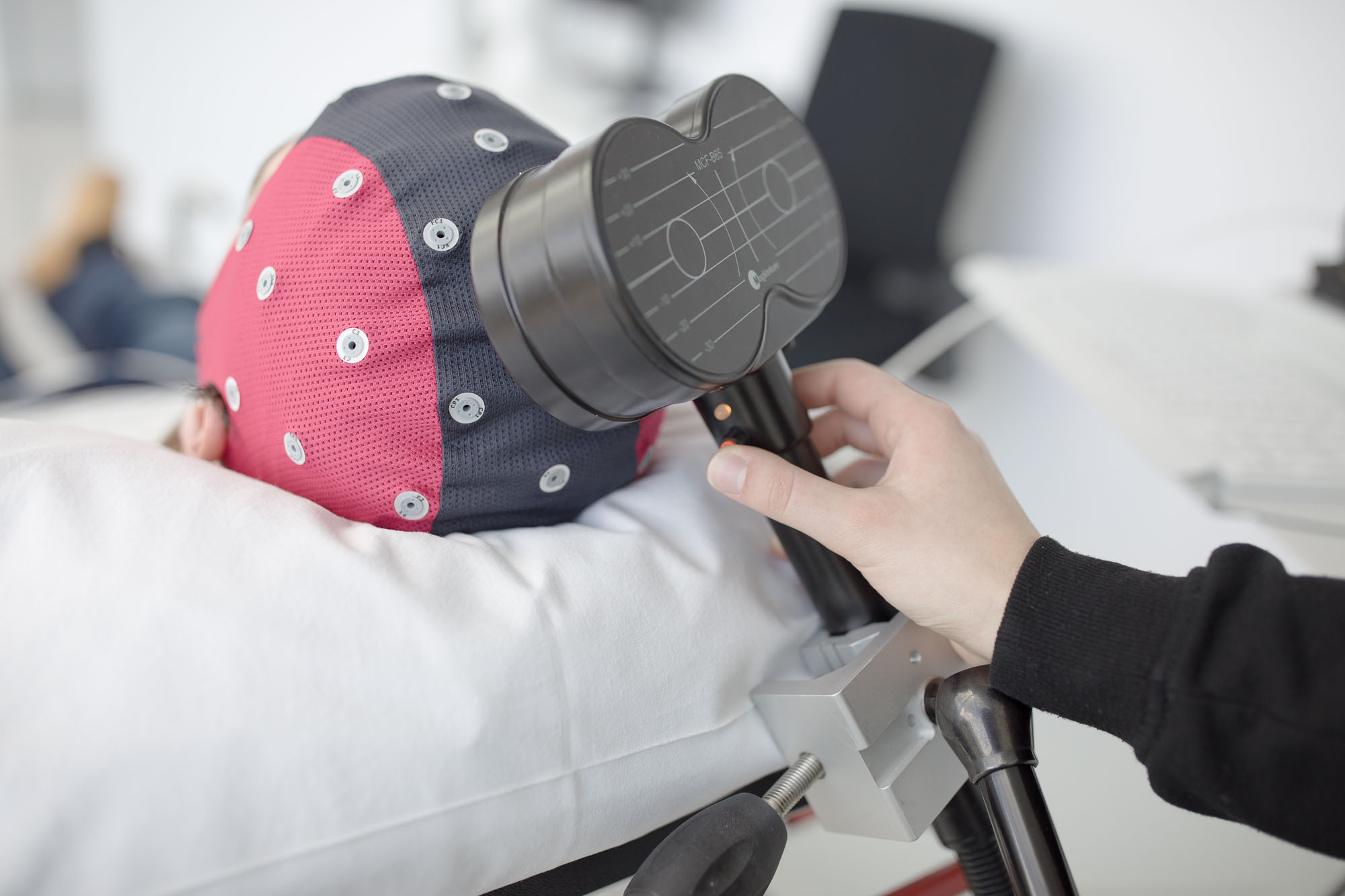 TMS staat voor Transcraniële Magnetische Stimulatie, oftewel magnetische stimulatie van de hersenen. Bij een TMS-meting wordt er een elektromagneet licht tegen het hoofd aan gehouden. De elektromagneet geeft korte, ongevaarlijke magnetische pulsen af, waarmee door de schedel heen de hersenen worden gestimuleerd. Als deze pulsen worden gegeven in een deel van de hersenschors dat de beweging van de hand aanstuurt, veroorzaken deze een korte beweging van de pink. Door middel van elektrodes (kleine metalen plaatjes) zullen wij de reactie in de spier van de pink meten.